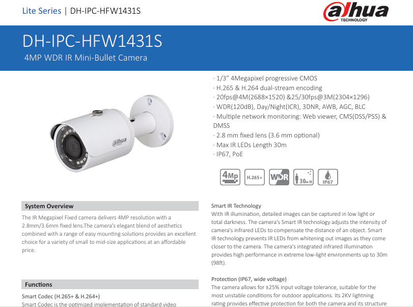 Dahua 6MP CCTV IP Camera DH-IPC-HDW4631C-A 2.8mm > 1/2.9” 6Megapixel progressive CMOS > H.265&H.264&MJPEG triple-stream encoding >20fps@6MP(3072×2048),25/30fps@4MP(2688×1520) > Smart detection supported > WDR(120dB), Day/Night(ICR), 3DNR,AWB,AGC,BLC > Multiple network monitoring: Web viewer, CMS(DSS/PSS) & DMSS > 2.8mm fixed lens > Built-in MiC > Max. IR LEDs Length 50m > PoE NVR4216-16P-4KS2 16 Channel 1U 16PoE 4K & H.265 Lite Network Video Recorder